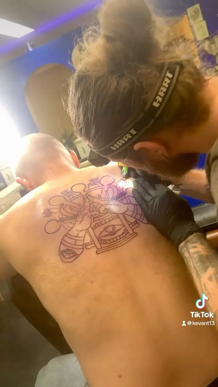 Kevan’s very first tattoo was a music note he drew himself in high school, meant to match with his high school sweetheart. The tattoo was done in his bedroom, but the match never happened—and neither did the relationship. Later, Kevan had it covered up with a stunning barn owl tattoo that now spans his entire right side.