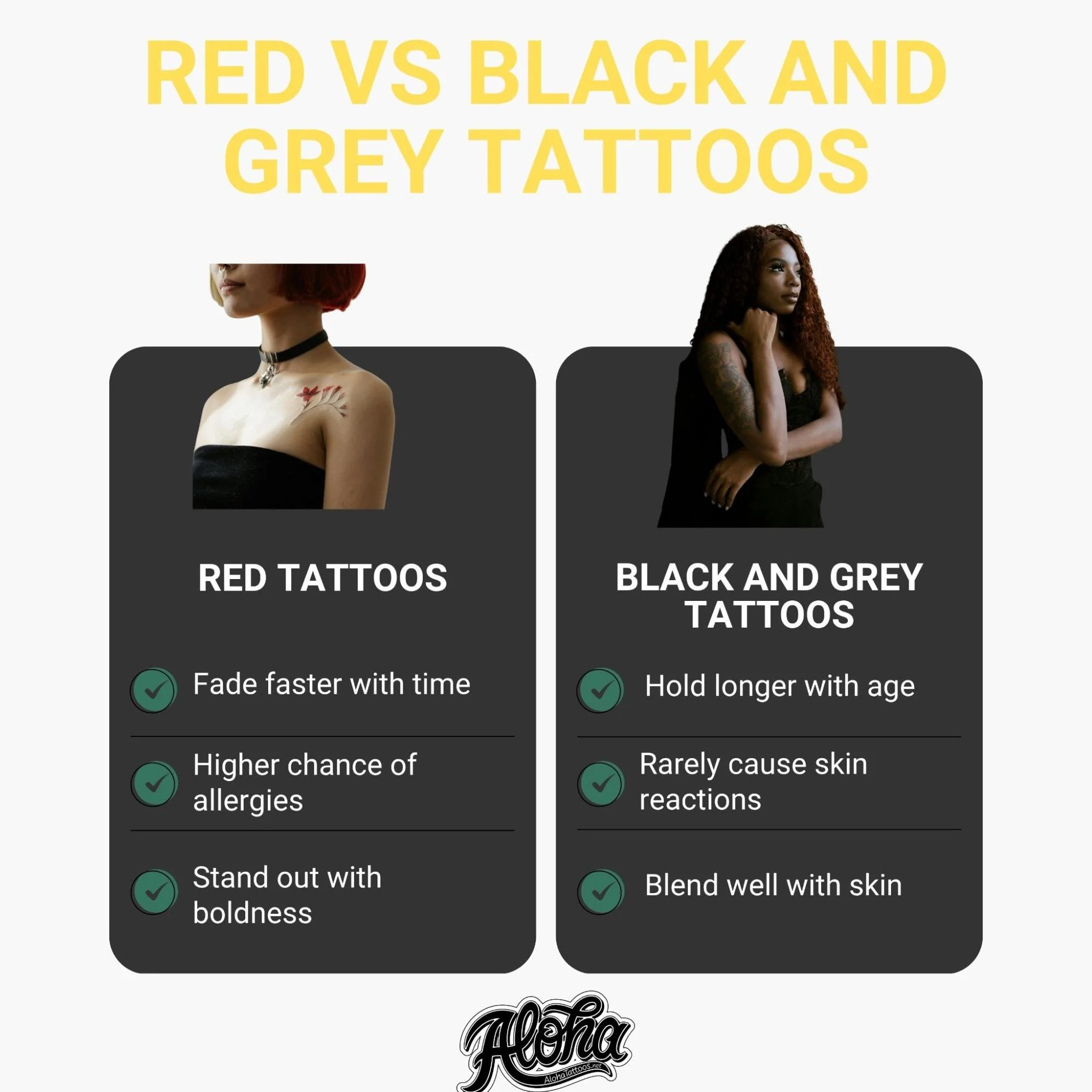 The cost of a red tattoo doesn’t differ up front, but the long-term value depends on how well it holds. Frequent touch-ups and color correction can increase the total expense over time.