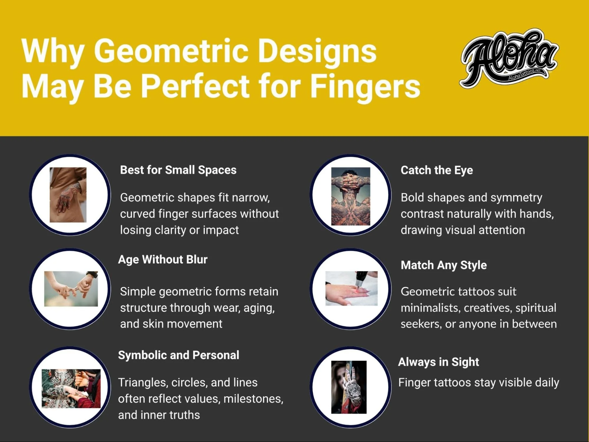Fingers are not wide or flat, so detailed or sprawling designs don’t hold up well. Geometric tattoos rely on clean shapes that fit neatly on narrow surfaces without losing meaning or impact. These designs hold their shape even when placed on curved, compact areas.