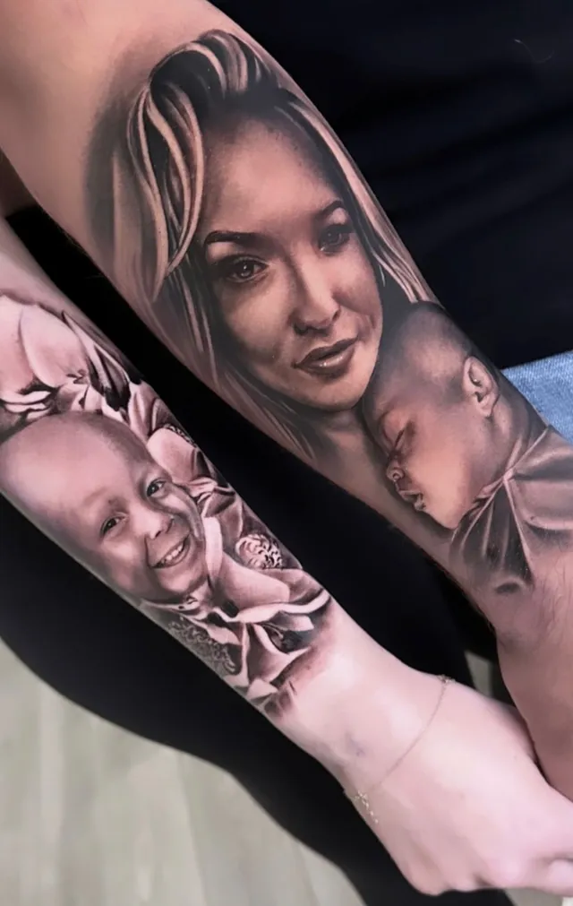 Choose meaningful designs, often names, portraits, or dates. Favor fine line, micro realism, or black and grey work. The emotional value outweighs the trend.